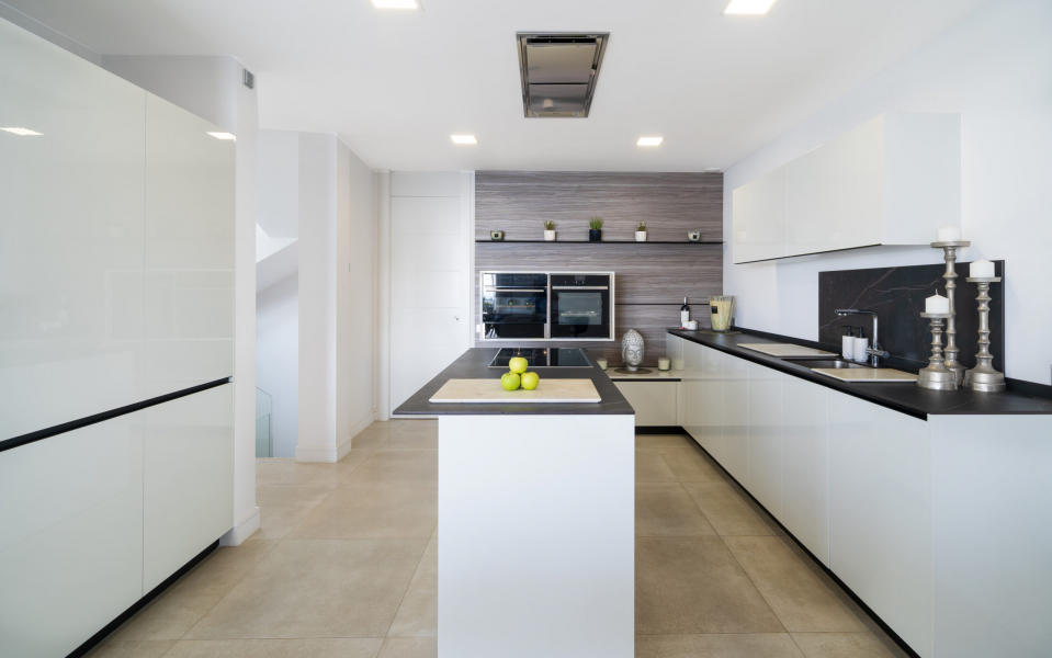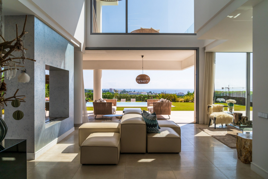 The large open plan living area is illuminated by full-height Schüco windows, offering captivating sea views. The double-height ceilings in the living area create a sense of grandeur. There’s also a spacious dining room with an open fireplace and a modern open-plan Italian kitchen with high-end appliances.