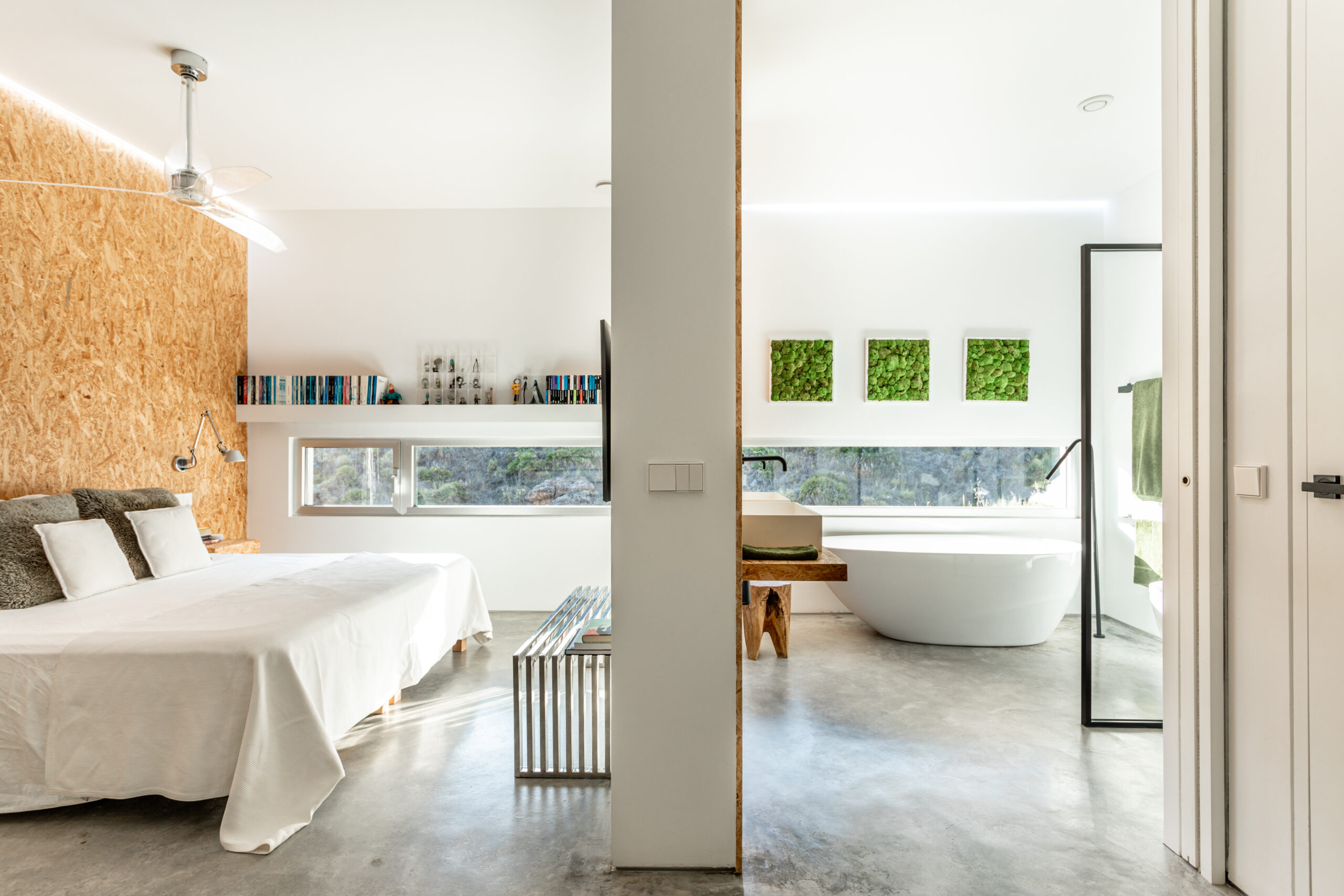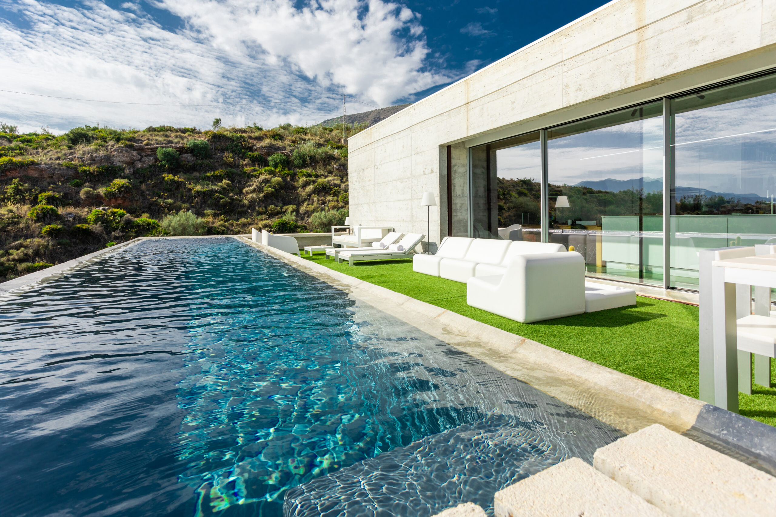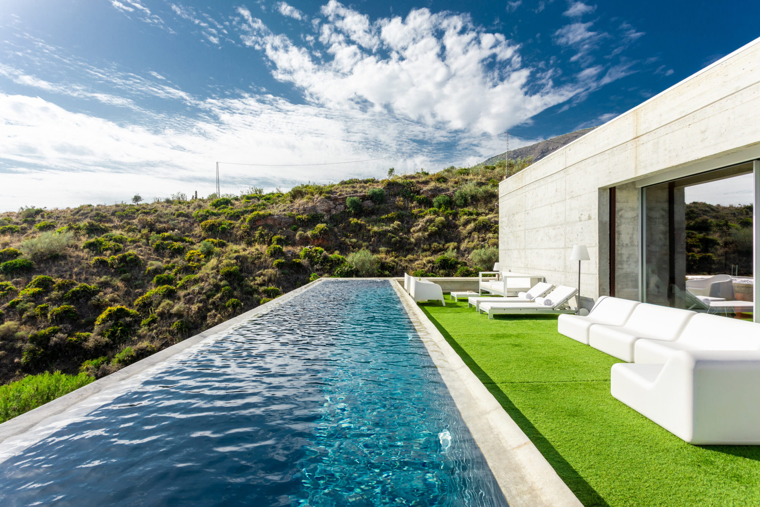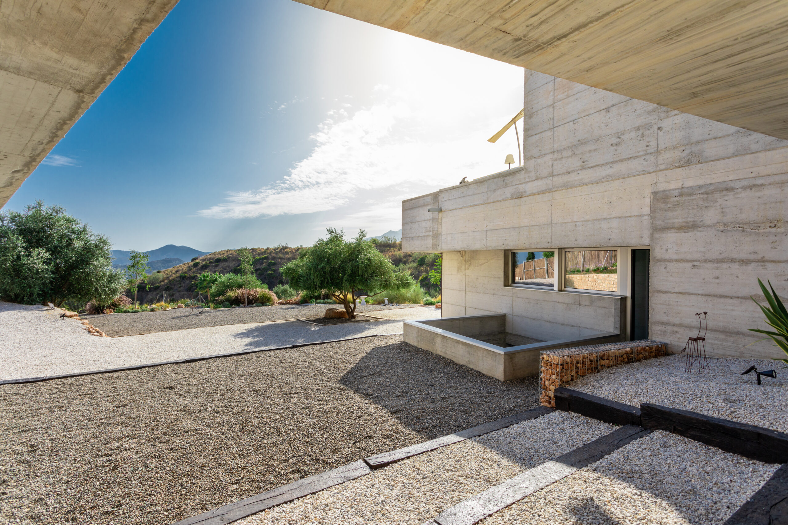 The house borders to the west with a stream, and to the north with a green area, overlooking a monumental pine forest of the Sierra de Mijas. Designed by the renowned architect Elisa Valero Ramos, known in the architecture sector as the architect of concrete, she has managed to create a house integrated into the environment, minimally invasive and sustainable, obtaining the highest Energy Efficiency Rating A.It consists of 3 levels, on level 0 at street level, which is accessed through a walkway, we find a courtesy toilet with a built-in natural sunlight irradiator, a living room with a corner fireplace, a dining room, a pantry and an open kitchen, with a large window in the living room that overlooks a large natural vertical garden with native species; On this floor there is access to the terrace with a 12-meter panoramic saltwater pool.