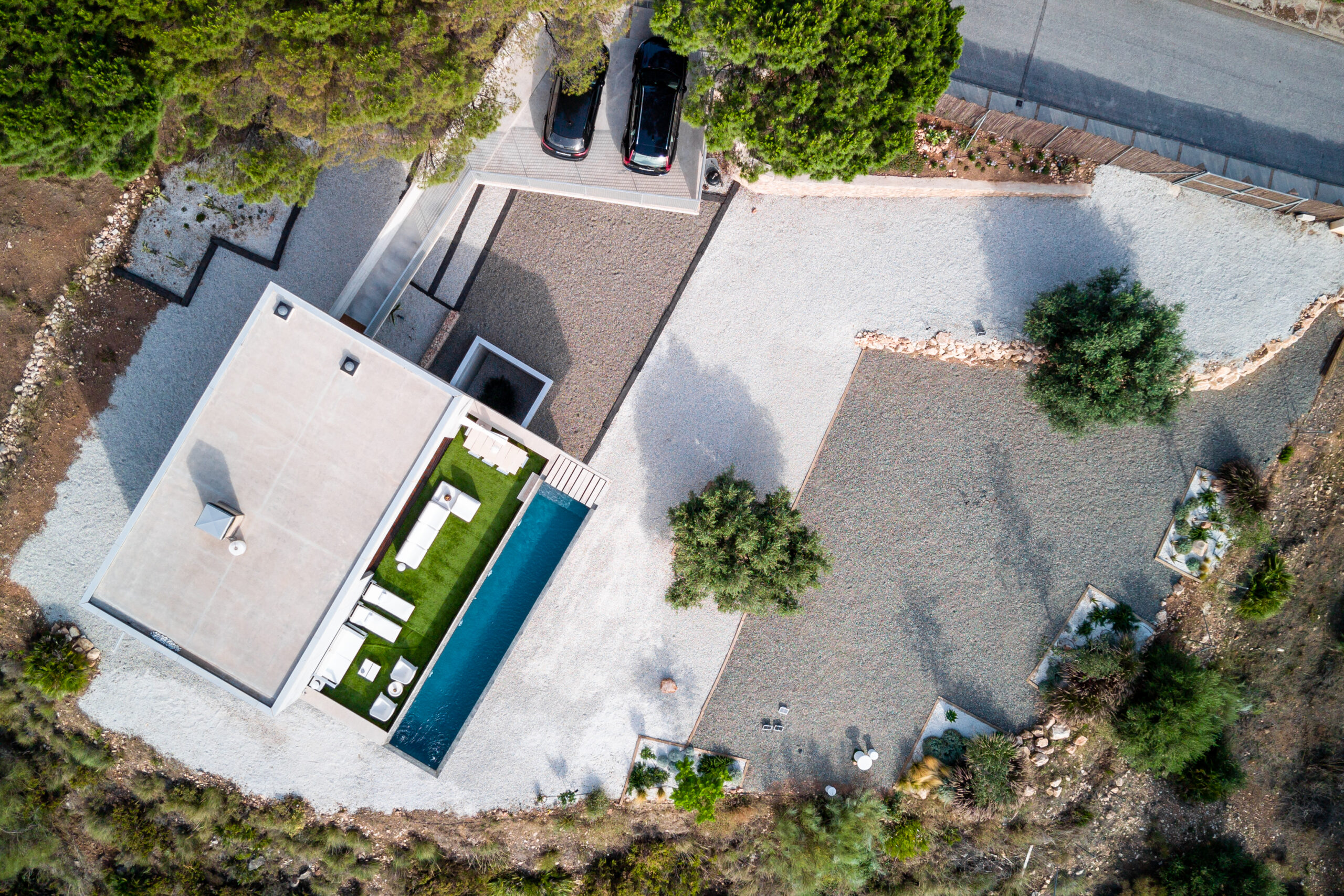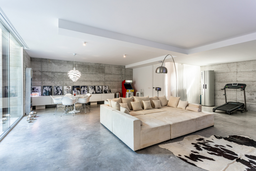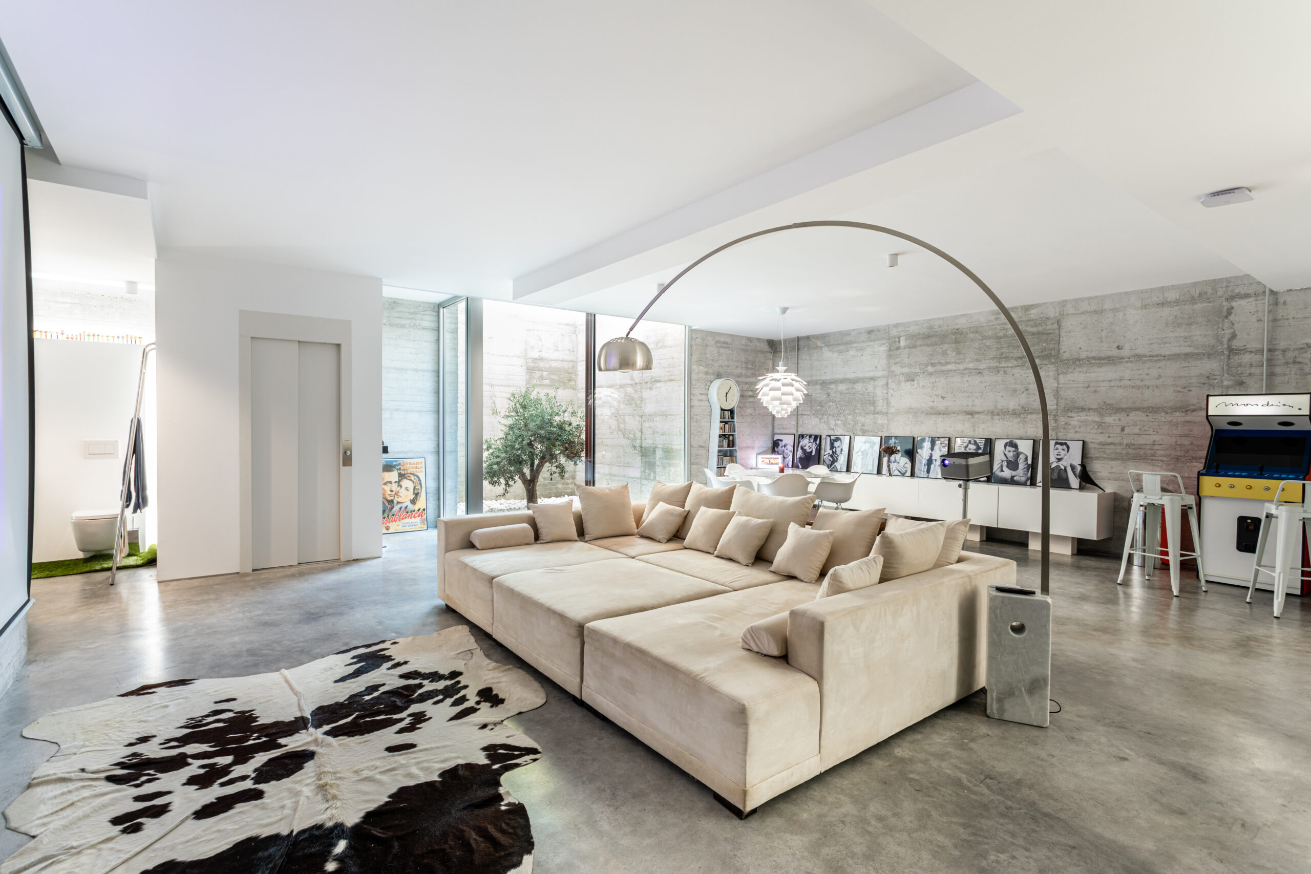 Finally, the basement level is designed as a recreational and leisure area, with an English patio that provides natural light throughout the day, a cinema room with anti-thermal opaque blind systems. On this level, the location of a third bedroom is planned and it already has a shower room.All the enclosures, of the Cortizo brand with a minimalist profile and anti-thermal and soundproofing treatment, keep the house perfectly insulated, in addition the windows have domotised opaque anti-thermal blinds. The interior carpentry is made up of floor-to-ceiling panoramic wooden doors with silent magnetic closing systems.The villa has a double-flow ventilation system, with Zehnder ComfoFresh air distribution, bringing fresh and pure air to all rooms and eliminating stale, humid and polluted air, as well as odours, with temperature exchange and level detection. of oxygen, reaching to renew the air of the house up to 40 times a day. The air conditioning has been solved by Daikin Altherma aerothermal, with underfloor heating, hot/cold, managed by the intelligent Airzone system, checking outside temperature, humidity levels and interior condensation for optimal management of thermal comfort levels. The same system provides sanitary water to the house.It has an elevator that registers the 3 levels, with glass and steel doors, with Solar overhead lighting, exterior surveillance cameras, alarm system, Siemens / Bosch, Franke appliances. Lighting with LED technology.